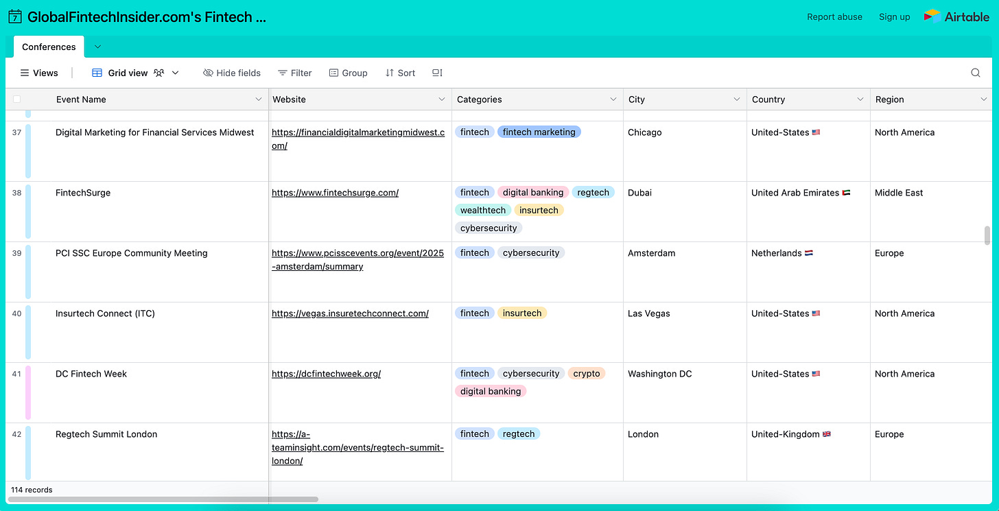 You can go through more than 100 fintech conferences listed below in chronological order or can also access the database we built on Airtable, where you can filter by date, duration, region or category.